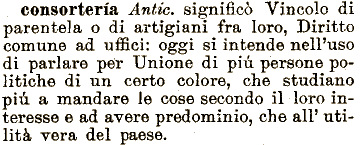 di un certo colore, che studiano più a mandare le cose che ali' utilità consorteria Antic. significò Vincolo di parentela o di artigiani fra loro, Diritto comune ad uffici: oggi si intende nelPuso di parlare per Unione di più persone politiche secondo il loro interesse e ad avere predominio, vera del paese.