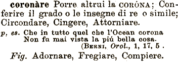 ; Conferire il grado o le insegne di rč o simile; Circondare, Cingere, Attorniare. p. es. Ohe in tntto quel che POceān corona Non fu mai visfca la pių bella coronare Porre altrui la CORĶNA cosa. (BERNI, Orol., 1, 17, 5 . Fig. Adornare, Pregiare, Compiere,