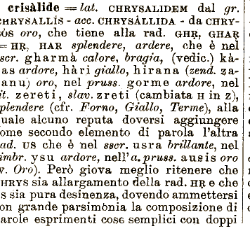affÀR ==H^L HAR splendere, ardere^ che è itfìi scr. gharmà Galore-, elemento di parola Paltra ad. us che è nel ^er. usra brillante, ÙHRYSÀLLIDA - da CHRY (ós oro, che tiene alla rad. an^, bragia, (vèdio.) kàas ardore, hàr.i giallo, hiTana (aend. aaa n u) oro, nel pruss. semplici nel m6r. y su ardore, wìVa.pruss. ausis oro y. Oro). Però giova meglio ritenere òhe HRYS sia allarg'amento della rad. H^t e che s sia pura desinenza, dovendo ammettersi ori grande parsimònia la composizione di aro le esprimenti cose crisàlide ==»7a. CHRYSAUDEM dal /r. ÌHKYSÀLLÌ8 - flCO* g o r m e ardore, nel »%. z ereti, «?av. z rè ti (cambiata H in z), plendere (cfr. Forno, Giallo, Terme), alla uale alcuno reputa doversi aggiungere ome secondo con doppi