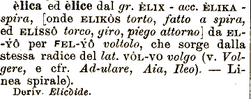 ÈLIKA spira, èlica ed èlice dal gr. ELIX - acc. [onde ELIKÒS torto, fatta a spira, ed ELÌSSÒ torco, giro, piego attorno] da EL-YÒ per FEL-YÓ voltolo, che sorge dalla atessa radice del lai. VÓL-VO volgo (v. Volgere, e cfr. Ad-ulare, Aia, Ileo), — Linea spirale). Deriv. Elicoide.