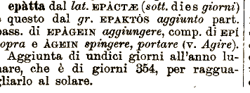 dies giorni) ^ questo dal gr. EPAKTÒS aggiunto part. ass. di EPÀ&EIN aggiungere^ comp. di epàtta dal lai. BPÀCT^S {sott. BTPÌ opra e ÀGBIN spingere, portare (v. Agire). Aggiunta di undici giorni all'anno luiare, che è di giorni 364, per ragguagliarlo al solare.