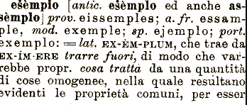 altri ad atti cattivi o non degni. E falera prendesi per Ammaestramento Deriv. Esemplare; Esemplatwo; Esemplificare [comprovare, spiegare con esempi], onde Esemplificativo, Esemplificazione; data o presa a modello (v. Esimere). PLTJM ==PULUM è terminazione, come o Norma cavata dal fatto altrui. Azione o Modo di operare, che, se buono o virtuoso, dia altrui occasione ed incitamento a imitarlo o ad emularlo; se riprovevole, possa spingere in tanti altri nomi, p. es. capulum === capulum cappio ecc. (v. ,..plo). Scémpio.
