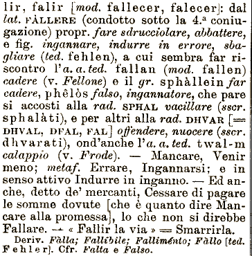 dh varati), ond'anche Va.a.ted. twal-m calappio (v. Frode). — Mancare, Venir meno; metaf. Errare, Ingannarsi; e in senso attivo Indurre in inganno. — Ed anche, dal lat. FÀLLERE (condotto sotto la 4.8 coniugazione) propr. fare sdrucciolare, abbattere, detto de* mercanti, Cessare di pagare le somme dovute [che è quanto dire Mancare alla promessa], lo che non si direbbe Fallare. —•- « Fallir lir, falir [mod. fallecer, falecerj: la via » === Smarrirla. Deriv. Falla; Fallibile; e fig. ingannare, indurre fallan (mod. fallen) cadere (v. Fellone) e il gr. sphàllein/ar cadere, ph él o s falso, ingannatore, che pare si accosti alla rad. SPHAL vacillare (sscr. sphalàti),e per altri alla rad. DHVAR [==== DHVAL, DFAL, FALJ offendere, nuocere (sscr. in errore, sbagliare (ted. fehien), a cui sembra far riscontro Va.a.ted. Fallimento; Fallo [ted. F e h 1 e r]. Cfr. Falla e Falso.