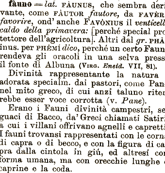 FÀUNUS, che sembra der: vante, come FÀUTOR fautore, da FAVÈR favorire^ dal gr. PHÀ inus. per PHÈMÌ dico, perché un certo Faun rendeva gli oracoli in una selva press il fonte di Albuna (VIRO. Eneid. VII, ond' anche FAVÒNIUS il venticeli lettore dell'agricoltura}. Altri caldo della primavera: [perché special prc Erano i Fauni divinità campestri, se guaci di Bacco, da'Greci chiamati Satir: a cui i villani offrivano agnelli e caprett: I fauni trovansi rappresentati con le corn di capra o di becco, e con la figura di ca pra dalla cintola in giù, ed altresì co] forma 81). Divinità rappresentante la natura adorata specialm. dai pastori, come Pan nel mito greco, di cui anzi taluno ritei rebbe esser voce corrotta (v. Pane). fàuno === lai. umana, ma con orecchie lunghe caprine e la coda.