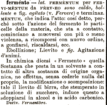 a MÈNTUM, che indica Patto: cosi detto, perché sotto Fazione del fermento le particelle della materia, che sta contatto, conlinciano a muoversi con più o meno violenza, a ricomporsi con nuovo ordine, a lai FEBMÈNTUM per FERVI-MKNTUM da FKRV-EO sono caldo, bollente e fig. agitato (v. Fervere) e terminaz. gonfiarsi, riscaldarsi, ecc. Ebollizione; Lievito e ^.Agitazione d'animi. In chimica dicesi « Fermento » quella Sostanza che posta in un solvente a contatto di altra sostanza di origine organica, ne effettua, senza cederle nulla di birra, che stemperato in soluzione di zucchero, induce questo a sdoppiarsi in alcool e in acido carbonico. Deriv. Fermentare. del proprio, la modificazione o scomposizione: tale il lievito ferménto ===