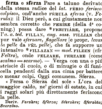 scarmo). — Verga con una o pii striscie di cuoio, o di FÈRIO ferisco colpisco, ond'anche FERULA sferza (v. Fé rula}: il Diez però, a cui giustamente noi sembra corretto che FERIRE (della 4:3 co niug.) possa dare *FERITIÀRE, propon( Va.a.ted. FILLAN, ang. sass. FILLIAN ch pur vale sferzare, flagellare [e propr. leva} la pelle da FÉL pelle}, che fa supporre * FILLAZAN == ur intensivo caldo, ne^ giorni di estate, in cu i raggi solari più direttamente feriscono la pelle. Deriv. Fersàre! Sfèrza; Sferzare; minugie o di funi cella pendenti dalla sua cima per batter o menar colpi. Oggi comunem. Sferza. « Fersa o Sferza del sole » I/ora de maggior tèrza e sfèrza Pare a taluno derivato dalla stessa radice del lai. mod. FILZEN (cfr Feltro), onde FELZARE, FERZARE (com scalmo === Sferzata Sverzino.