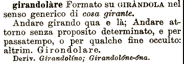 Formato su. OIKÀNDOLA nel senso generico di cosa girante. Andare girandolare girando qua e là; Andare attorno senza proposito determinato, e per passatempo, o per qualche fine occulto: altrim. Girondolare. Deriv. Girandolino: GirandoÌ6ne-!na,.