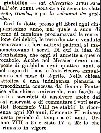 anni, e oggi si annette a questo Aprile. Nella chiesa •attolica è una indulgenza plenaria e traordinaria concessa di assolvere anche dai asi riservati e di commutare i voti semplici. Bonifazio Vili ne stabili ipecie di giubbileo ogni quattro lei regno di Laos in Asia ricorre annualnente nel mese di la ricorenza ogni 100 anni, dal Sommo Ponteìce alla chiesa universale, con facoltà a ulti i sacerdoti ginbbilèo === lai. chiesastico JUBIL^BUM lali' ebr. JOBEL montone e in senso traslato 'orno, tromba^ e poi la solennità del giubnieo. Cosi fu. detto presso gli Ebrei ogni cinquantesimo anno, nel quale a suon di ^orno di montone proclamavasi la remisiione dei debiti, le terre donate o vendute •ornavano ai loro antichi padroni, si malomettevano i servi. Di qui la idea di remissione, che vocabolo. Anche nel Messico oravi una Clemente VI ridusse mesto periodo di tempo a 50 anni, Urlano Vili a 35 e Sisto IV a 25: lo che rimasto in vigore.
