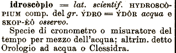 o misuratore del tempo per mezzo delPacqna; altrim. detto Orologio idroscopie == lai. scienti/. HYDROSCÒPIUM comp. del gr. YDKO == YDÒR acqua e SKOP-ÈÒ osservo. Specie di cronometro ad acqua o Clessidra.