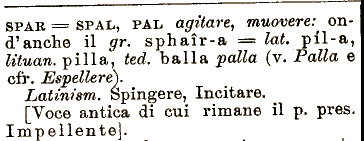 muovere: ond^anche il gr. sphaìr-a == lai. pil-a, lituan. pilla, ted. balla palla (v. Palla e cfr. Espellere). Latinism. Spingere, Incitare. [Voce antica di cui rimane il p. pres. SPAR === SPAL, PAL agitare^ Impellente].