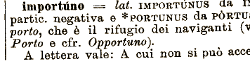 lat. IMPORTÙNUS importuno === da r partic. negativa e ^PORTUNUS da PÒRTU| porto, che è il rifugio dei naviganti (-v Porto e cfr. Opportuno). A lettera vale : A cui non sì può acce