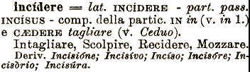 della partic. IN in (v. in l.\ e CREDERE tagliare (v. Ceduo). Intagliare, Scolpire, Recidere, Mozzare Deriv. Incisióne; Incisivo; Inciso; Incisore; Incisorio; incidere === lat. INCÌDERE - pari. pass, INOISUS - comp. IncisHra.