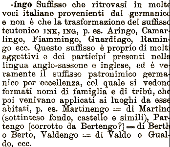 e non č che la trasformazione del suffissc teutonico INK, INO, p. es. Aringo, Cāmar' lingo, Fiammingo, Guardingo, Ramingo ecc. Questo suffisso č proprio di molti aggettivi e dei participi presenti nella lingua che ritrovasi in molt voci italiane di famiglia e di tribų, che poi venivano applicati ai luoghi da esse abitati, p. es. Martinengo == di Martinc (sottinteso fondo, castello e simili), Partengo [corrotto da Bertengo?]===di Berth o Berto, Valdengo == di Yaldo provenienti dal germanice anglo-sassone e inglese, ed č veramente il suffisso patronimico germanico per eccellenza, col quale si vedonc formati nomi -ingo Suffisso o G-ualdo, ecc.