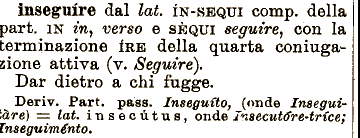 lat. IN-SEQUI comp. della part. IN m, verso e SÈQUI seguire^ con la inseguire dal terminazione IRE della quarta coniugazione attiva (v. Seguire). Dar dietro a chi fugge. Deriv. Part. pass. Inseguito^ (onde Insegui',àre) •==- lat. insecùtus, onde Insecut^re-trice; Inseguimento.