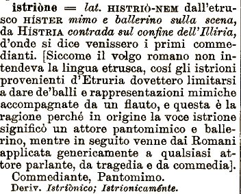 ballerino, mentre in seguito venne dai Romani applicata genericamente a qualsiasi attore parlante, da tragedia e da commedia]. Commediante, istrióne == lai. HISTRIÒ-NEM dall'etrusco confine dell7 Illiria, d'onde si da un flauto, e questa è la ragione perché in origine la voce istrione significò un attore pantomimico e dice venissero i primi commedianti. [Siccome il volgo romano non intendeva la lingua etnisca, cosi gli istrioni provenienti d'Etruria dovettero limitarsi a dare de'balli e rappresentazioni mimiche accompagnate HÌSTER mimo e ballerino sulla scena, da HISTRIA contrada sul Pantomimo. Deriv. Istri^nico; IstrionicamSnte^