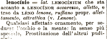a LENOCÌNOR accarezzo, alletto^ e trae da LÈNO lenone^ ruffiano propr. allettamento, attrattiva (v. Lenone). Qualsiasi affettato ornamento, per sedurre Rocchio o la mente: lenocinlo === lai. LBNOCINIUM che sta accanto in senso più speciale, Prostituzione del? altrui pudi