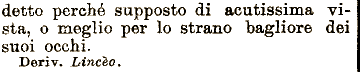 o meglio per lo strano bagliore detto perché sapposto di acutissima vista, dei snoi occhi. Deriv. Lincèo,