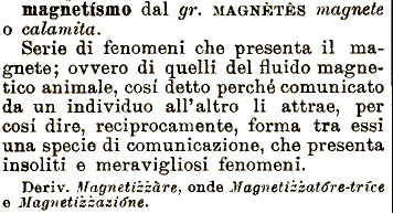 dire, reciprocamente, forma tra essi una specie di comunicazione, che presenta magnetismo dal gr. MAGNETÈS magnete I o calamità. Serie di fenomeni che presenta il magnete; ovvero di quelli del fluido magnetico animale, cosi detto perché comunicato da un individuo al? altro li insoliti e meravigliosi attrae, per cosi fenomeni. Deriv. Magnetizzare, onde Magneti'zzatffre-trzce e Magnetizzazione.