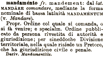 comandare, mediante la forma nominale di autorità di bassa latinità MANDAMÉNTUM (v. Mandare). Propr, Ordine col quale si comanda, o si fa venire; e specialm. Ordine pubblicato da persona rivestita mandaménto fr. mandement: àallat. MANDARE e giurisdizione; per sineddoche Divisione territoriale, nella quale risiede un Pretore, che ha giurisdizione civile e penale. Deriv. Mandamentale.