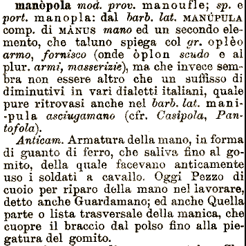 pure ritrovasi anche nel di ferro, che saliva fino al gomito, della quale facevano anticamente uso i soldati a cavallo. Oggi Pezzo di cuoi? per riparo della mano nel lavorare, barb. lai. mani-pula asciugamano (cfr. Casipola^ Pantofola). Anticam. ma che invece sembra non essere altro che un suffisso di diminutivi in vari dialetti italiani, quale Armatura della mano, in forma di guanto manòpola moà. prov. manoufle; sp. e pori, detto anche Guardamano; ed anche Quella parte o lista trasversale della manica, che cuopre il braccio manopla: dal fiorò, lai. MANÙPULA comp. di MÀNUS mano ed un secondo elemento, che taluno spiega col gr. o pie o armo, fornisco (onde òplon scudo e al plur. armi, masserizie^ dal polso fino alla piegatura del gomito*