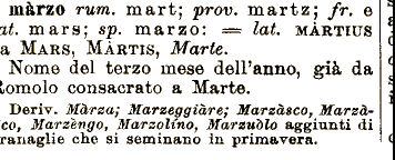 Marte. Nome del terzo mese dell'anno, giā da tomolo consacrato a Marte. Deriv. Marna! Marzeggiare; UaraāscOf Marza'.co, marzo rum. mari; prov, martz; fr. e orķ. mars; sp. marzo: == lai, MĀRTICS a MAKS, MĀKTIS, MarsėngOf Marzolino, Maraublo aggiunti di ranaglie che si seminano in primavera.