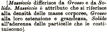 che si riferisce alla densità delle masse corporee) Grosso alla loro estensione [Massiccio differisce da Grosso e da Solido. Massiccio è attributo e grandezza, Solido all'aderenza delle particelle che le costituiscono].