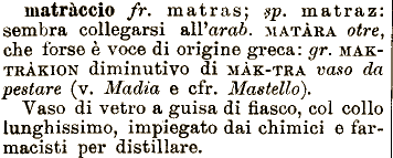 vetro matrāccio fr. matras; ^p. matraz: sembra collegarsi alParaō. MATĀRA otre, che forse č voce di origine greca: gr. MAKTRĀKION diminutivo di MĀK-TRA vaso da pestare (v. Madia e cfr. Mastello). Vaso di a guisa di fiasco, col collo lunghissimo, impiegato dai chimici e farmacisti per distillare.