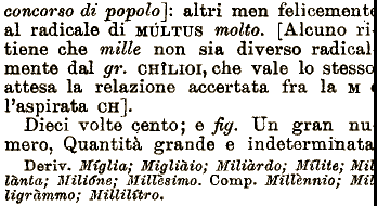 la relazione accertata fra la M l'aspirata OH]. Dieci volte cento; e fig. Un gran nu mero, Quantità grande e indeterminata Deriv. Miglia; Migliàio; concorso di popolo]: altri men felicemente al radicale di MÙLTUS molto. [Alcuno Miliardo; Milite; ri tiene che mille non sia diverso radicai mente dal gr. CHÌLioi,che vale lo stesso attesa Mil lànta; Milione; Millesimo. Comp. Millènnio; Mil ligràmmo; Millilitro.