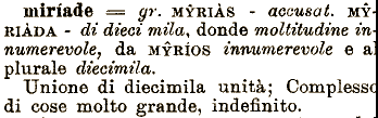 MYRÌOS innumerevole e a] plurale diecimila. Unione di diecimila miriade ==== gr. MYRIÀS - accusai. MYRIÀDA - di dieci mila, donde moltitudine innumerevole, da unità; Complesse di cose molto grande, indefinito.