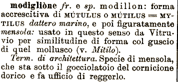 guscio di quel e sp. modillon: forma accrescitiva di MÙTULUS o MÙTILUS === MYTILUS dattero marino^ e poi figuratamente mensola: usato in questo senso da Vitruvio per similitudine di forma col mollusco (v. Mitilo), Term. di architettura. Specie di mensola, che sta sotto il gocciolatoio del cornicione dorico e fa ufficio di modiglióne/r. reggerlo.