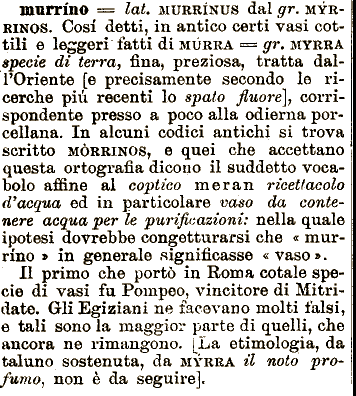 tratta vaso da contenere acqua per le purificazioni: nella quale ipotesi dovrebbe congetturarsi che « murrino » in generale significasse « vaso ». Il primo dall'Oriente [e precisamente secondò le ricerche più recenti lo spato fluoro}, murrino == lai. MURRINUS dal gr. MYRRINOS. Cosi corrispondente presso a poco alla odierna porcellana. In alcuni codici antichi si trova scritto MÒRRINOS, e quei che accettano questa ortografia dicono il suddetto vocabolo affine al coptico meran ricettacolo d'acqua ed in particolare molti falsi, e tali sono la maggior parte di quelli, che ancora ne rimangono. [La etimologia, da taluno sostenuta, da MYRRA detti, in antico certi vasi cottili e leggeri fatti di MURRA == gr, MYRRA specie di terra, fina, preziosa, che portò in Roma cotale specie di vasi fu Pompeo, vincitore di Mitridate. Gli Egiziani ne facevano il noto profumo^ non è da seguire].