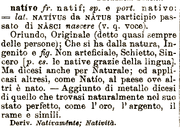 (detto quasi sempre dicesi anche per Naturale; ed applicasi altresė, come Natio, al paese ove altri č nato. Aggiunto di metallo dicesi di quello delle persone); Che si ha dalla natura, ingenito che trovasi naturalmente nel suo stato perfetto, come Poro, P argento, il rame e simili. Deriv. e fig. Non artefieiale, Schietto, Sincero [jp. es. le native grazie della lingua]. Ma nativo /r. natif; Ŧp. e pori. nativo: === ^. NATĖVUS da NĀTUS participio passafco di NĀSCI nascere (v. q. voce). Oriundo, Originale Nativamente; Nativitā.