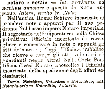 incaricato di prendere note o appunti per il suo padrone; Nel basso impero: Notare imperiale, II segretario dell' imperatore ; nella Chiesa notare e notàio === lai. Ufficiale incaricato di raccogliere e conservare in note o appunti gli atti de'martiri; Oggi Ufficiale pubblico, che riceve e redige gli atti volontari riguardanti negozi altrui. Nella Corte Pontificia dicesi Notaro apostolico l'Ufficiale incaricato della spedizione degli affari ecclesiastici* NOTÀKIUS da NOTARE annotare e questo da NÒTA primitiva: oppunto, lettera, scritto (v. Nota}. NelPantica Roma: Schiavo Deriv. Notaitfsco, Notarésco e NotariSsco; ant. Notaria-eria == Notariato} Notarile.