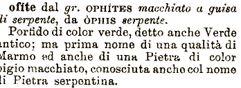 dal gr. OPHITES macchiato a guisa li serpente^ da ÒPHIS serpente. Porfido di color verde, détto anche Verde otite intico; ma prima nome di una qualità di tlarmo ed anche di una Pietra di color igio macchiato, conosciuta anche col nome li Pietra serpentina.