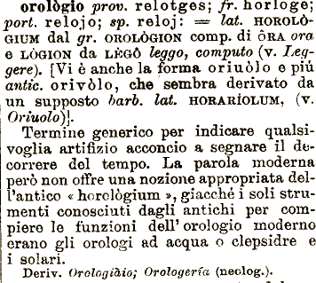 anche la formar orinolo e più antic. ori vólo, eh® sembra derivato da nn sapposto barb. lodi. HOBARIOLUM, (v. Orinolo)}. Termine generico per indicare qualsivoglia conosciuti dagli antichi per compiere le funzioni dell'orologio moderno erano gli orologi ad acqua o clepsidre e i solari. Deriv. Orologiàio; Orologeria artifizio acconcio a segnare il decorrere del tempo. La parola moderna però non offre una nozione appropriata dell'antico « horològinm », giacché i soli strumenti (neolog.). orològio jprot?. relotges; /r. norloge; pori, relojo; sp. reloj: === lat. HOROLÒGIUM dal gr. OROLÒ&ION comp. di ÓRA ora e LÒ&ION da LEOÓ leggo, computo (v. leggere). [Vi è