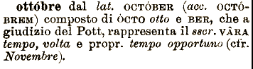 propr. ottóbre dal lat. OCTÓBER (acc. OOTÓBRBM) composto di ŅCTO otto e BER, che a giudizio del Pott, rappresenta il sscr, VARA tempo, volta e tempo opportuno (cfr. Novembre),