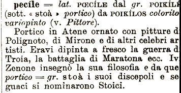 ar fisti. Eravi dipinta a fresco la guerra d Troia, la battaglia di Maratona ecc. Iv Zenone insegnò la sua in Atene ornato con pittare d: Polignoto, pecile = lat. PCECILE dal gr. POIKILI (sott. « stoà » portico) da POIKÌLOS colorito variopinto (v. Pittore). Portico di Mirone e di altri celebri filosofia e da que portico == gr. stoà i suoi discepoli e se guaci si nominarono Stoici.