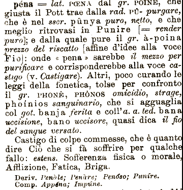 purificare e corrisponderebbe alla voce castzgo (v. Castigare). Altri, poco curando le leggi della fonetica, tolse per confronto il gr. PHONÈ, PHÒNOS omicidio, strage, phoinios sanguinario, che si agguaglia col got. banja ferita e col? a. a. ted. bana uccisione, bano uccisore, quasi dica il fio del sangue versato. Castigo di colpe commesse, péna === to. PCENA dai gr. POINE, cne giusta il Potfc trae dire Ciò che si fa, sonrire per qualche fallo: estens. Sofferenza fìsica o morale, onde « pena» sarebbe il mezzo per dalla rad. pù- purgare, che è nel s^cr. d^idee alla voce Fio]: pùnya puro, netto, e che meglio ritrovasi in Punire [==== render puro], e dalla quale pure il gr. à-poina prezzo del riscatto [affine che è quanto Afflizione, Fatica, Briga. Deriv. Penale; Penare; Penoso; Pumre. Comp. Appéna; ImpUne.