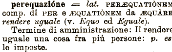 comp. di PER e ^BQUATIÒNEM da AQUÀRI rendere uguale (v. Equo ed Eguale). Termine di amministrazione: Ilrender uguale una cosa perequazióne •== lat. PBR^BQUATIÒNB» fra più persone: p. es le imposte.