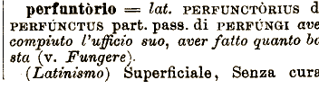 pass. di PERFÙNCH aw compiuto ^ufficio suo, aver fatto perfnntòrio == lai, PERFUNCTÒRIUS d PERFÙNCTUS parfc. quanto & sta (v. Fungere). (Latinismo) Superficiale, Senza cnn