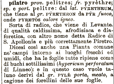 ne' campi intorno ai luoghi freschi ed umidi, che ha le foglie tutte ripiene come di buchi sottilissimi caso vuole taluno derivi dal gr, PYLÈ porta^ meato, a cagione dei forellini {hypericum perforatum di Linneo): e in questo tiene al gr. PYRETHRON da PYB fuoco, onde PYKBTÒS calore igneo, pilatro prov. pelitres; fr. pyrèthre; sp, e pori. p elitre: dal lai, pvjaETHBUM, che Sorta di radice, che viene di Levante. di qualità caldissima, afrodisiaca e diaforetica, con altro nome detta Radice di S. Apollonia e più. correttamente Piretro. Dicesi così anche una Pianta comune delle sue foglie.