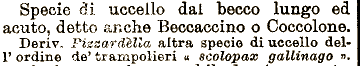 Deriv. Specie di uccello dai becco lungo ed ! acuto, detto anche Beccaccino o Coccolone. Piasardèlla altra specie di uccello delF ordine de' trampolieri u scolopax gallinago ".