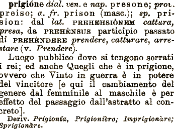 prendere, cattware, arrestare (v. Prendere). pubblico Luogo è per snetto del passaggio dall'astratto al consreto]. Deriv. Prigionfaf Prigionièro; prigióne àial. ven. e nap. p rosone; proi. preiso; o. /r. prison (masc.); sp^ prision: dal lai. PREHBHSIÒNKM cattura, presa, da PREHÈNSUS participio passato ii PRBHÈNDERE dove sì tengono serrati l rei; ed anche Quegli che è in prigione, 3wero che Vìnto in guerra è in potere lei vincitore [e qui fl cambiamento del cenere dal femminile al maschile Imprigionare; Sprigionare,
