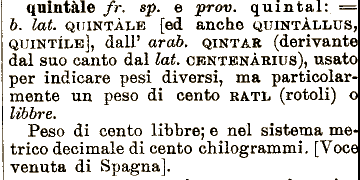 diversi, ma particolarmente un peso di cento RATL (rotoli) libbre. Peso di cento libbre; e nel sistema me trico decimale di cento chilogrammi. [Voc venuta di Spagna]. quintale fr. sp. e prov. quintal: == 6. lai. QUINTALE QUINTILE], dall* arab, QINTA& (derivane dal sao canto dal lai. CENTBNĀRIUS), usate per indicare pesi [ed anche -QUINTĀLLUS