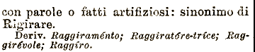 o fatti artinziosi : sinonimo di Higirare. Deriv. Eaggiraménto; .Raggiratfre-trwe; con parole ..Raggiravate; Raggiro.