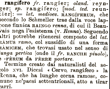RÀNGrÌFERUM, che secondo lo Schmeller trae dalla voce lappone finnica che trovasi usato nel senso di unga pertica [onde il fr. RANCHE pmolo]^ i -FÈRUM da FÈRRE portare. Termine creato dai naturalisti del secolo xvi. Dicesi « Cervo, rangifero » la R,enna, che ha RAINGO renna, di cui il Beau/ais nega l'esistenza (v. .Renna). Seguendo titri [mod. ted. reun-Aer}: == lai. medioev. potrebbe ritenersi composto del lat. ZÀMUS ramo, col sussidio di una forma IÀMICEM, rangifero fr. rangier; oland. reyn2;er; sp. rangifero, lunghe corna ramose, conune ne'paesi settentrionali, atto a tirar ;arri.