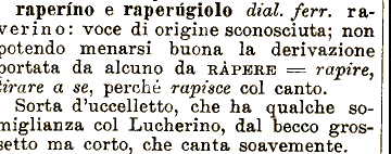 menarsi buona la derivazione portata da alcuno da canto. Sorta d'uccelletto, che ha qualche raperino e raperugiolo dial. ferr. raperino: voce di origine sconosciuta; non potendo RĄPERE = rapire, tirare a se^ perché rapisce col soniglianza col Lucherino, dal becco grossetto ma corto, che canta soavemente.
