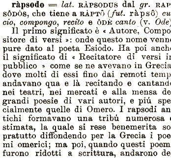 autori, e pił sp cialmente quelle di Omero. I rapsodi ar fichi formavano una tribł numerosa rapsodo === lat. RĄPSODUS dal gr. RAT SÓDŅS, che tiene a RĄPTÓ (fui. » : onde questo nome venn pure dato al poeta Esiodo. Ha poi anch il significato di « rąpsó) cz ciņ, compongo^ recito e ŅDE canto (v. Ode II primo significato č Autore, Compc sitore di versi e alla mensa d( grandi poesie di vari Recitatore di versi i pubblico » come se ne avevano in Grech dove molti di essi fino dai remoti tem^ andavano qua nei mercati e lą recitando e cantanct nei teatri, stimata, la quale si rese benemerita se pratutto diffondendo per la Grecia i poc mi omerici; ma poi, quando questi poem furono ridotti a scrittura, andarono d