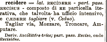 - pari. pass. RECÌSUS - composto dì RÈ particella iterativa, che talvolta- ha ufficio intensivo, e CREDERE tagliare (v. Ceduo). Tagliar via, Mozzare, Troncare, Amputare. Deriv. Reci'ciitSre-trice; recidere === lai. RECIDERE part. pass. Reciso, onde Recisione,