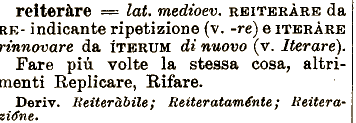 === lai. medioev. REITERARE da RK- indicante ripetizione (v. -rè) e ITERARE rinnovare da ITERUM di nuovo (v. Iterare). Fare più volte la stessa cosa, altrimenti Replicare, Rifare. Deriv. Reiteràhile ; Reiter atamente reiterare ; Reiterazione.